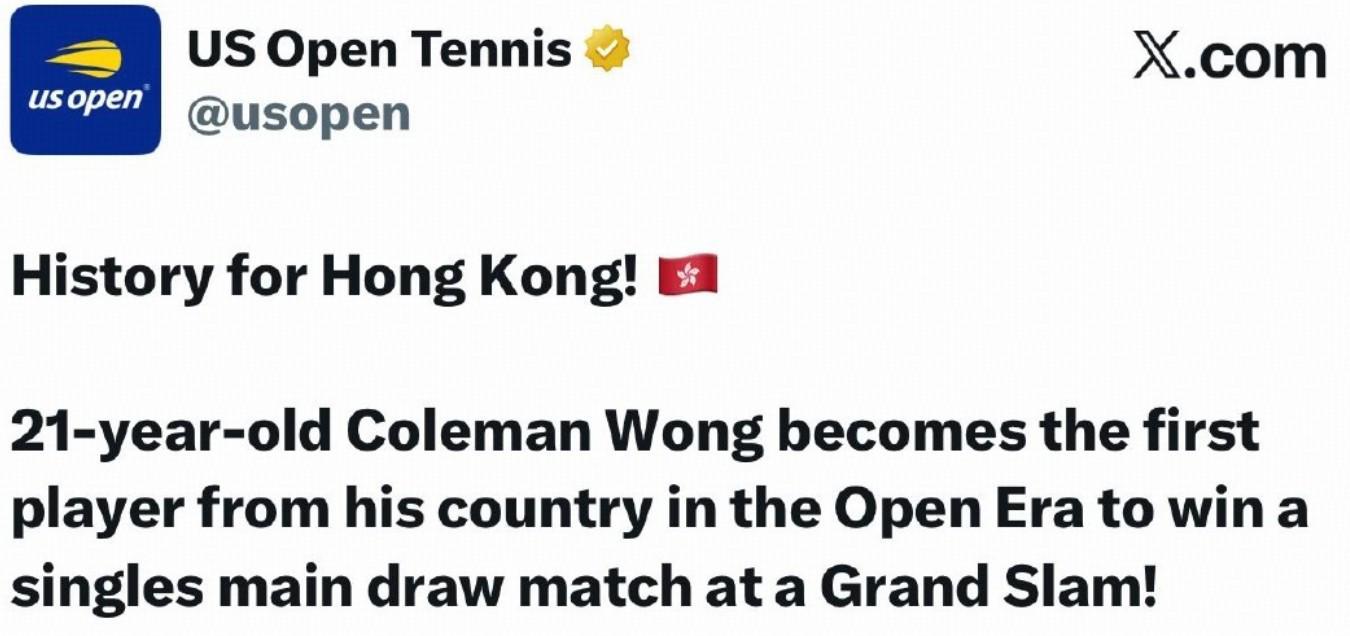 美网官方起初在社媒写道:“黄泽林成为第一名他的国家在公开赛年代取得大满贯胜利的选手。”但在不久之后,文案中的“his country”修改为了“Hong Kong”。